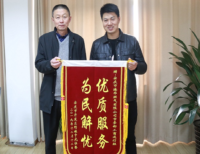 12月16日上午,市開發(fā)區(qū)野妹中式快餐負(fù)責(zé)人來到安慶港華,將一面繡有“優(yōu)質(zhì)服務(wù) 為民解憂”的錦旗,贈與公司工商運行組表示感謝。