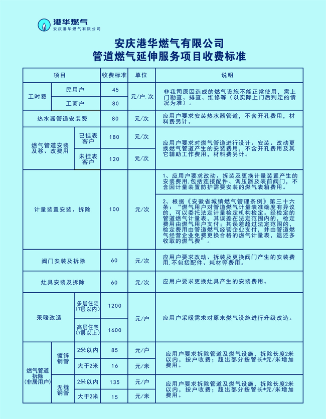 安慶市管道燃?xì)庋由旆?wù)項目及主要收費標(biāo)準(zhǔn)