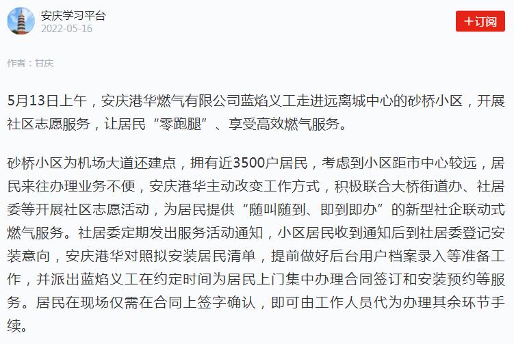 安慶:服務(wù)隨叫隨到 業(yè)務(wù)即到即辦 打造燃?xì)馍鐓^(qū)服務(wù)新模式(轉(zhuǎn)載于學(xué)習(xí)強(qiáng)國)