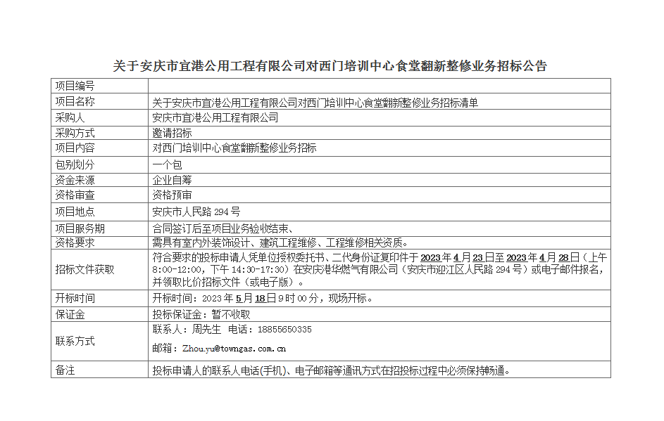 關(guān)于安慶市宜港公用工程有限公司對(duì)西門(mén)培訓(xùn)中心食堂翻新整修業(yè)務(wù)招標(biāo)公告