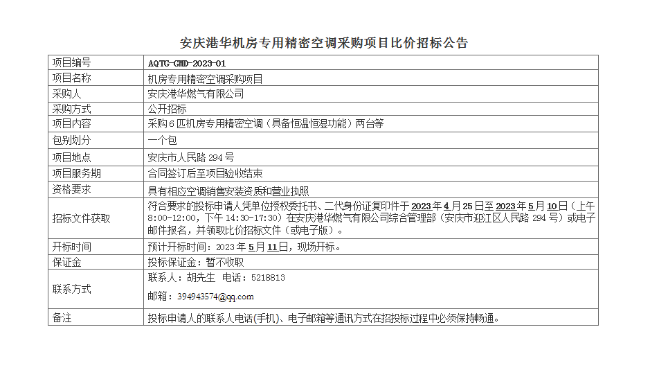 安慶港華機房專用精密空調(diào)采購項目比價招標(biāo)公告