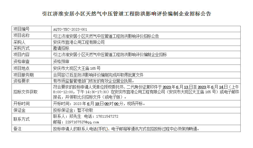 引江濟淮安居小區(qū)天然氣中壓管道工程防洪影響評價編制企業(yè)招標公告