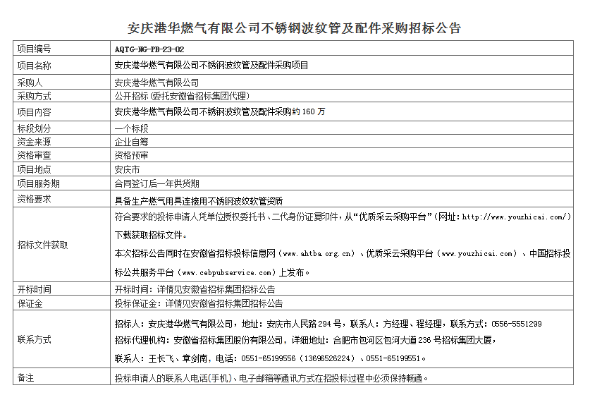 安慶港華燃?xì)庥邢薰静讳P鋼波紋管及配件采購招標(biāo)公告 發(fā)布時(shí)間:2023-07-07    閱讀次數(shù):5120次
