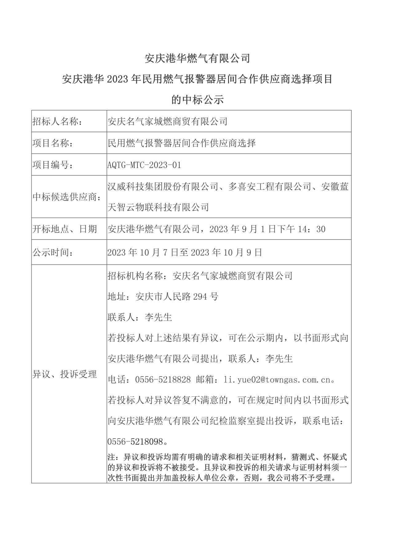 安慶港華燃?xì)庥邢薰?安慶港華2023年民用燃?xì)鈭缶骶娱g合作供應(yīng)商選擇項目的中標(biāo)公示
