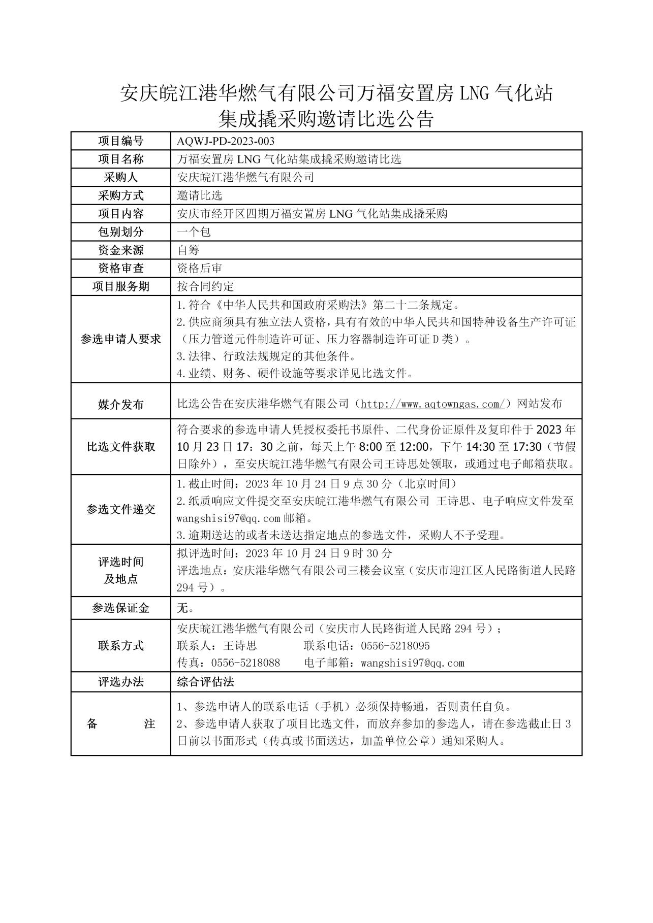 安慶皖江港華燃?xì)庥邢薰救f福安置房LNG氣化站集成撬采購邀請(qǐng)比選公告