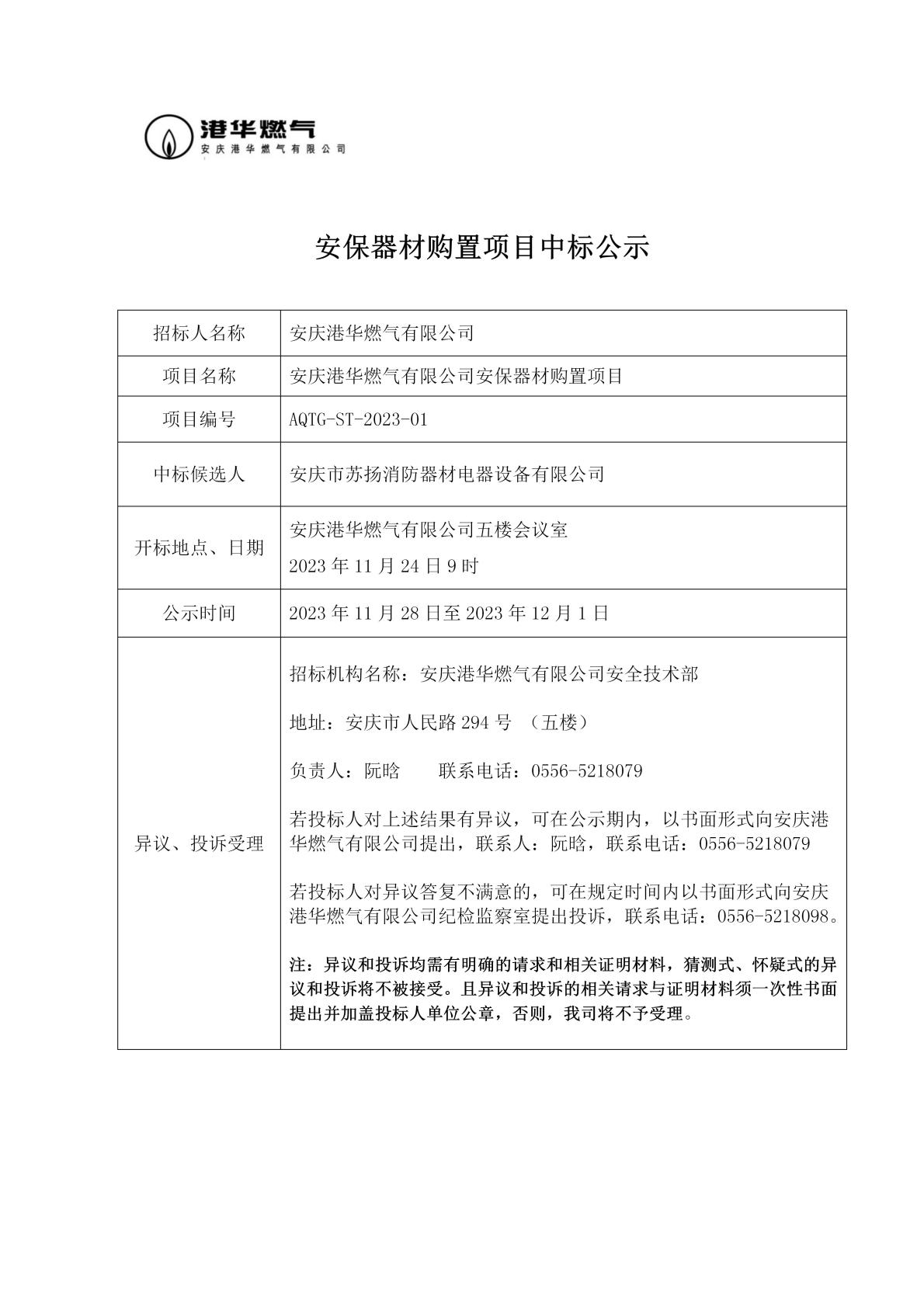 安慶港華燃氣有限公司2023年安保器材購置項目中標公告