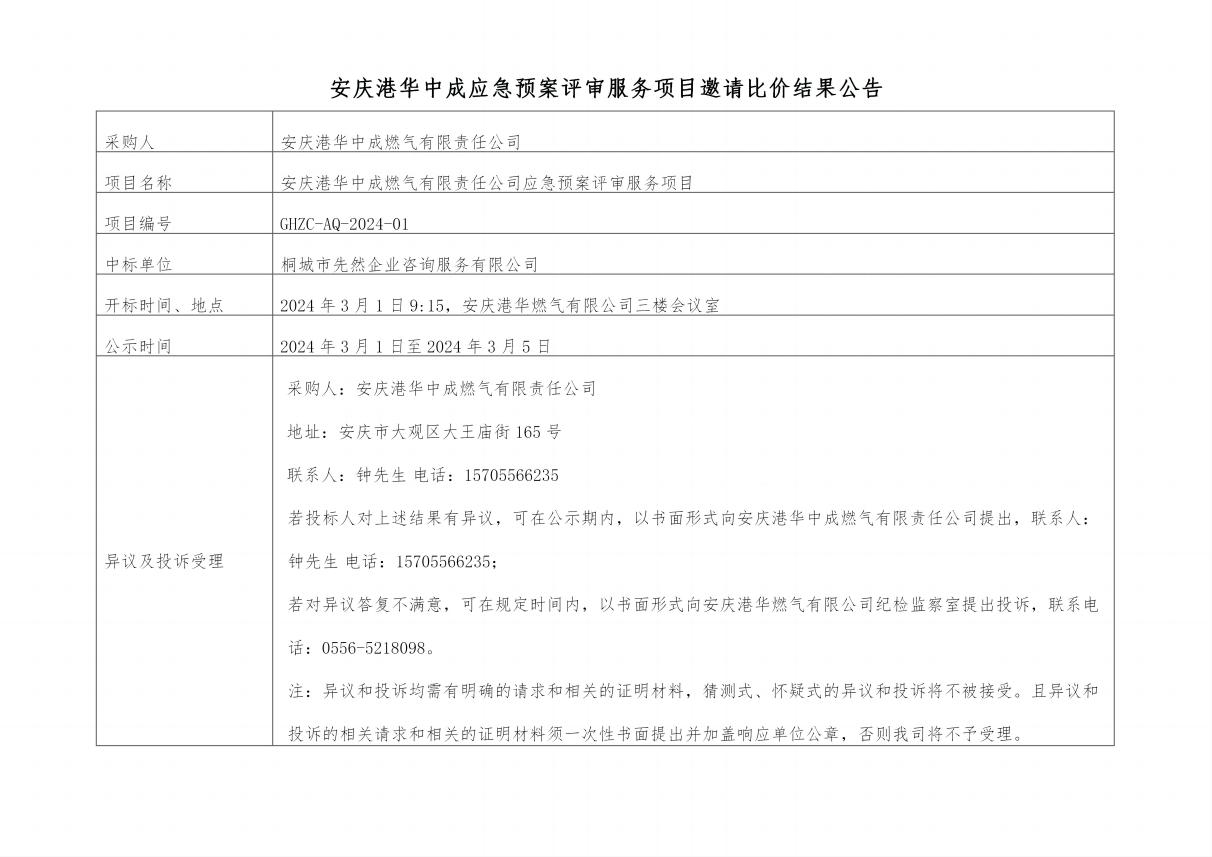 安慶港華中成應(yīng)急預(yù)案評(píng)審服務(wù)項(xiàng)目邀請(qǐng)比價(jià)結(jié)果公告