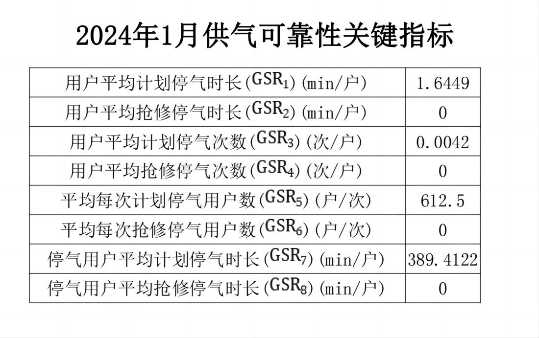 2024年1月供氣可靠性關(guān)鍵指標(biāo)