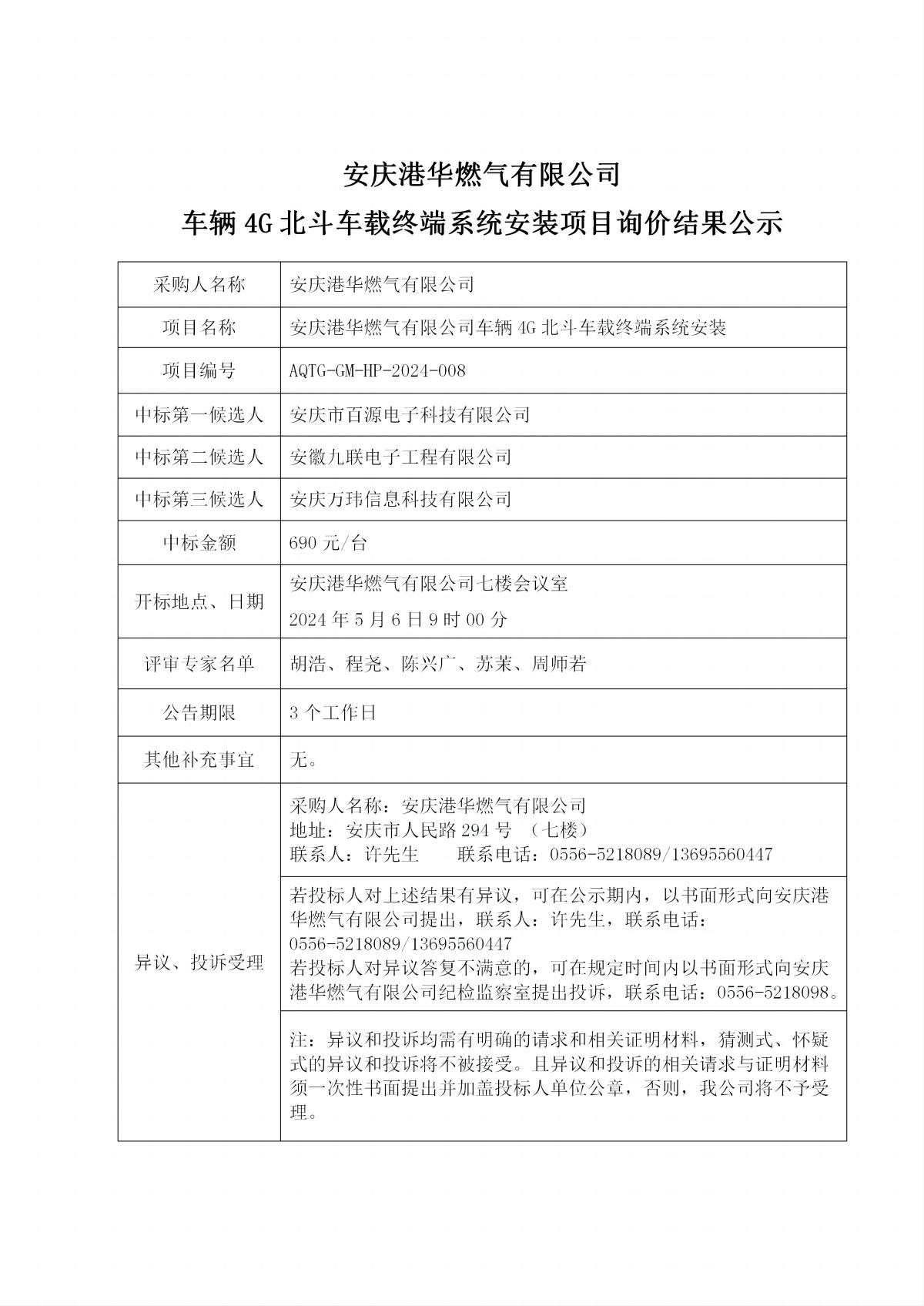 安慶港華燃?xì)庥邢薰拒囕v4G北斗車載終端系統(tǒng)安裝項目詢價中標(biāo)公示
