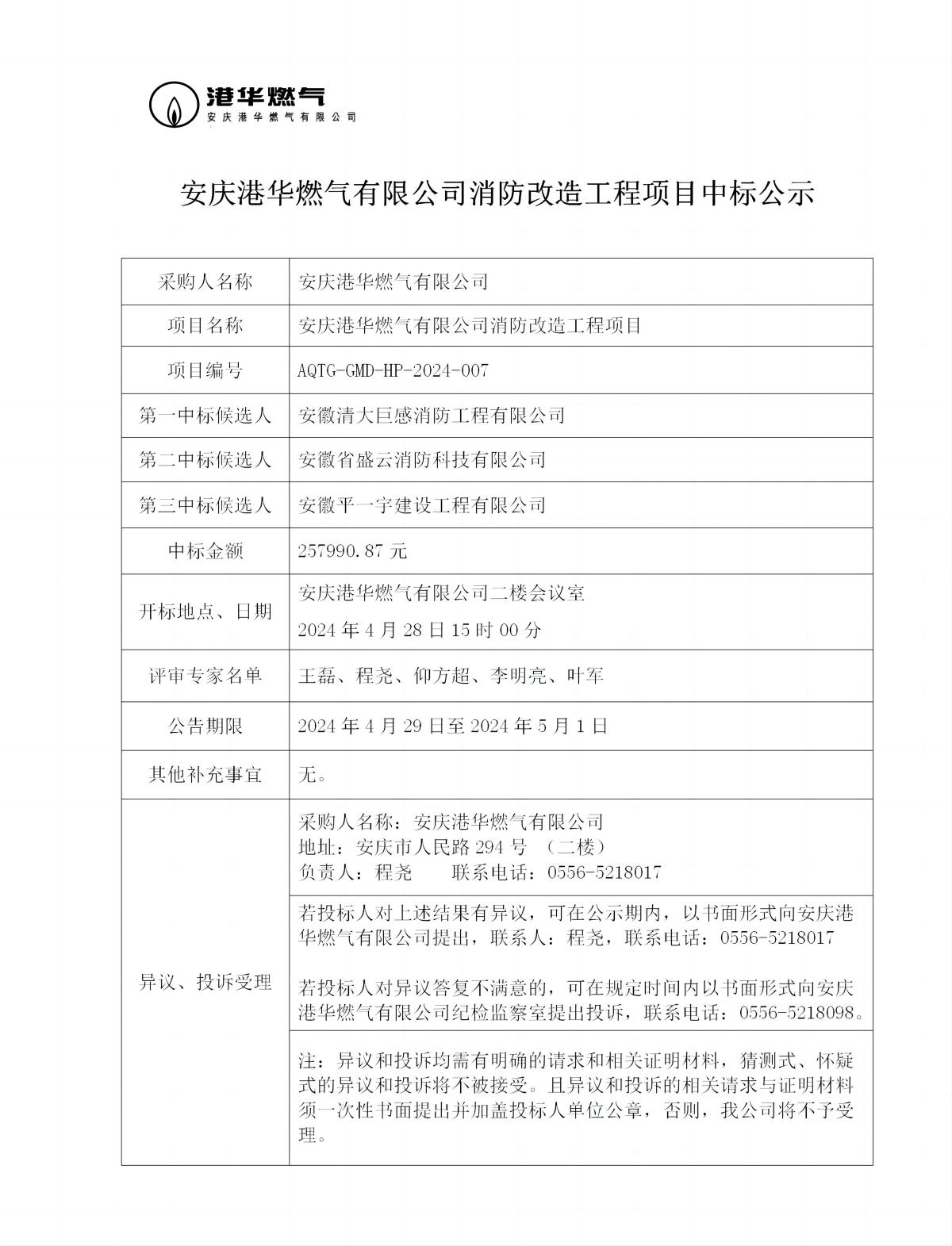 安慶港華燃?xì)庥邢薰鞠栏脑旃こ添?xiàng)目中標(biāo)公示