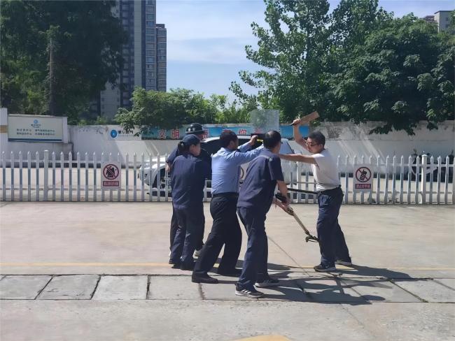 演練模擬了一起發(fā)生在加氣站的歹徒持刀威脅加氣工作人員的惡性事件。站內員工發(fā)現(xiàn)嫌疑人員后,手持盾牌及警棍立即上前阻攔,其他人員及時配合并撥打轄區(qū)民警電話報警,站內員工利用警棍、鋼叉等防衛(wèi)武器配合到達現(xiàn)場的民警將歹徒制服。