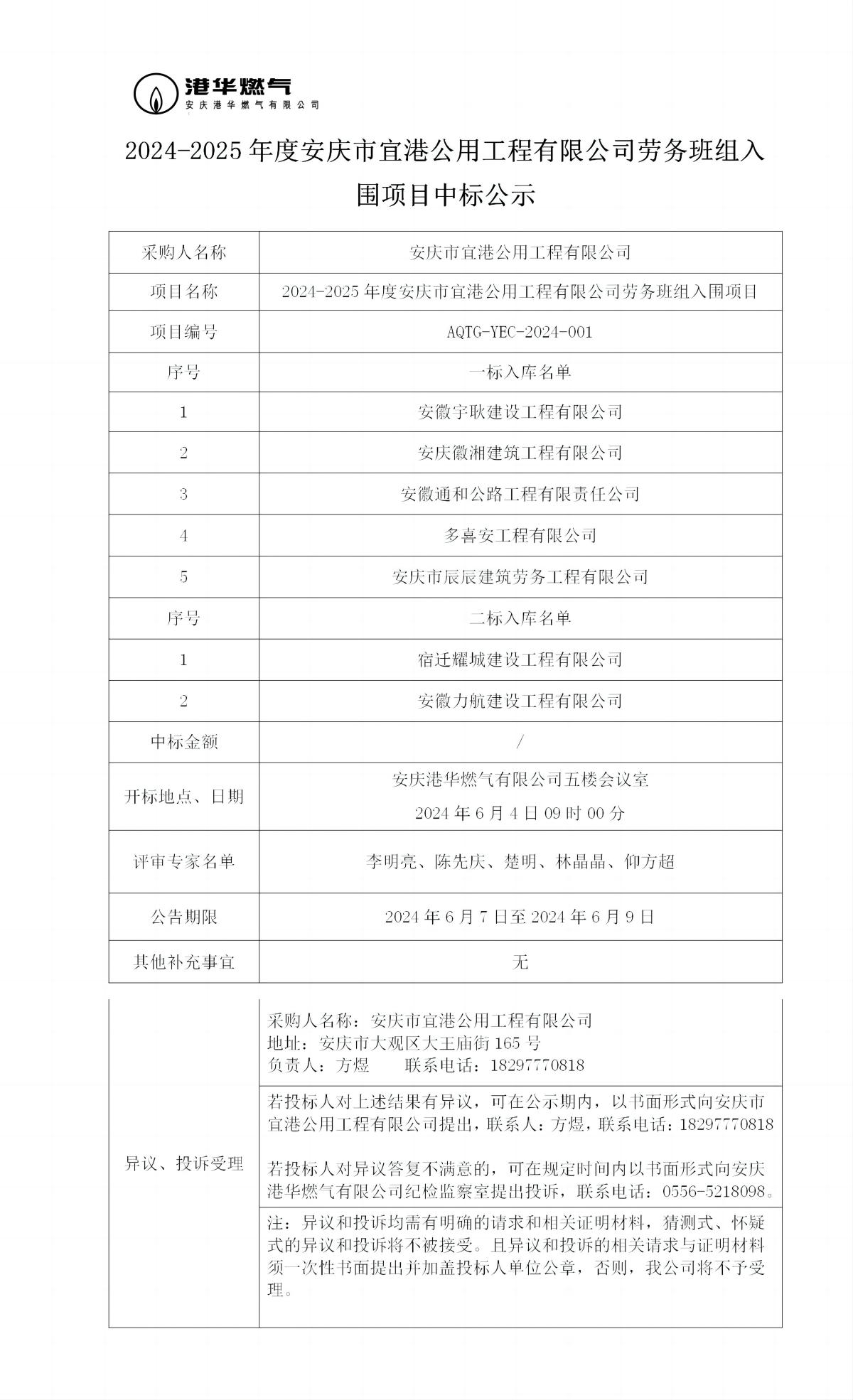 2024-2025年度安慶市宜港公用工程有限公司勞務班組入圍項目中標公示