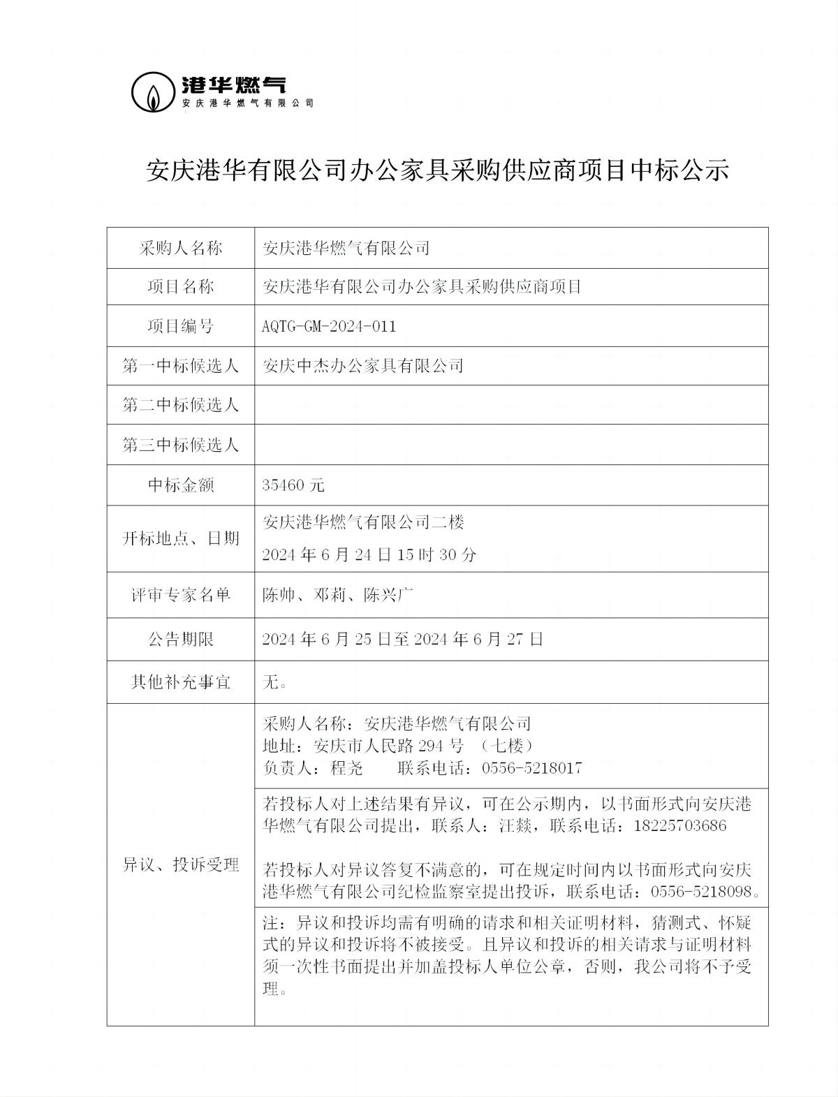 安慶港華有限公司辦公家具采購供應(yīng)商項(xiàng)目中標(biāo)公示