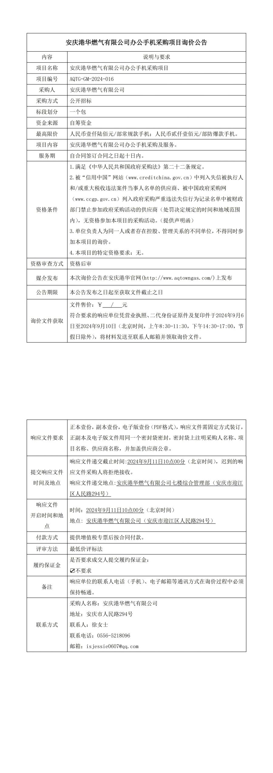 安慶港華燃氣有限公司辦公手機采購項目詢價公告