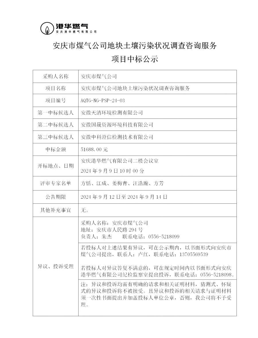 安慶市煤氣公司地塊土壤污染狀況調(diào)查咨詢服務(wù)項(xiàng)目中標(biāo)公示 發(fā)布時(shí)間:2024-09-12    閱讀次數(shù):3009次