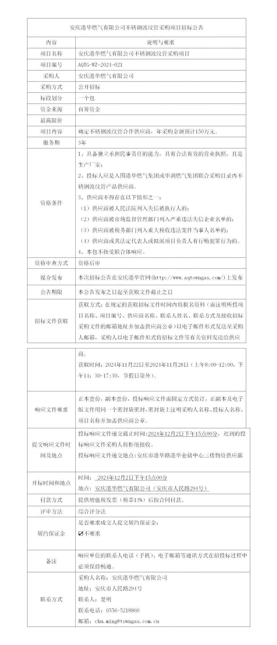 安慶港華燃氣有限公司不銹鋼波紋管采購項目招標公告 發(fā)布時間:2024-11-21    閱讀次數(shù):3267次