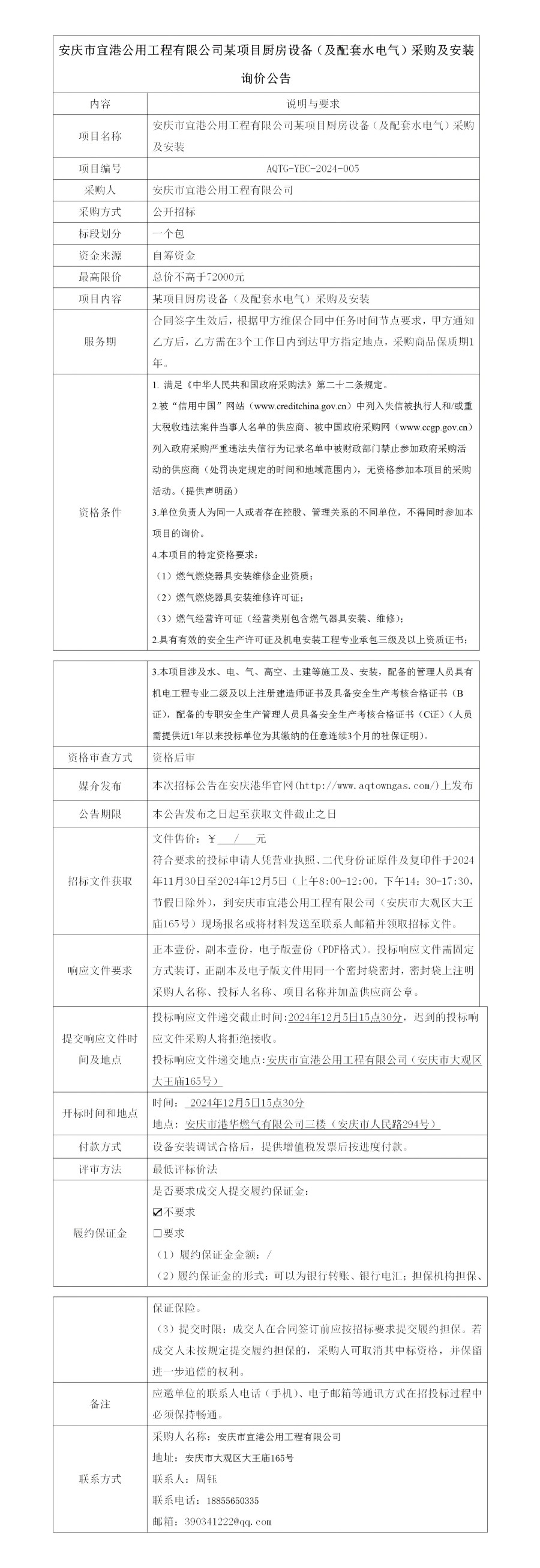 安慶市宜港公用工程有限公司某項目廚房設(shè)備(及配套水電氣)采購及安裝詢價公告