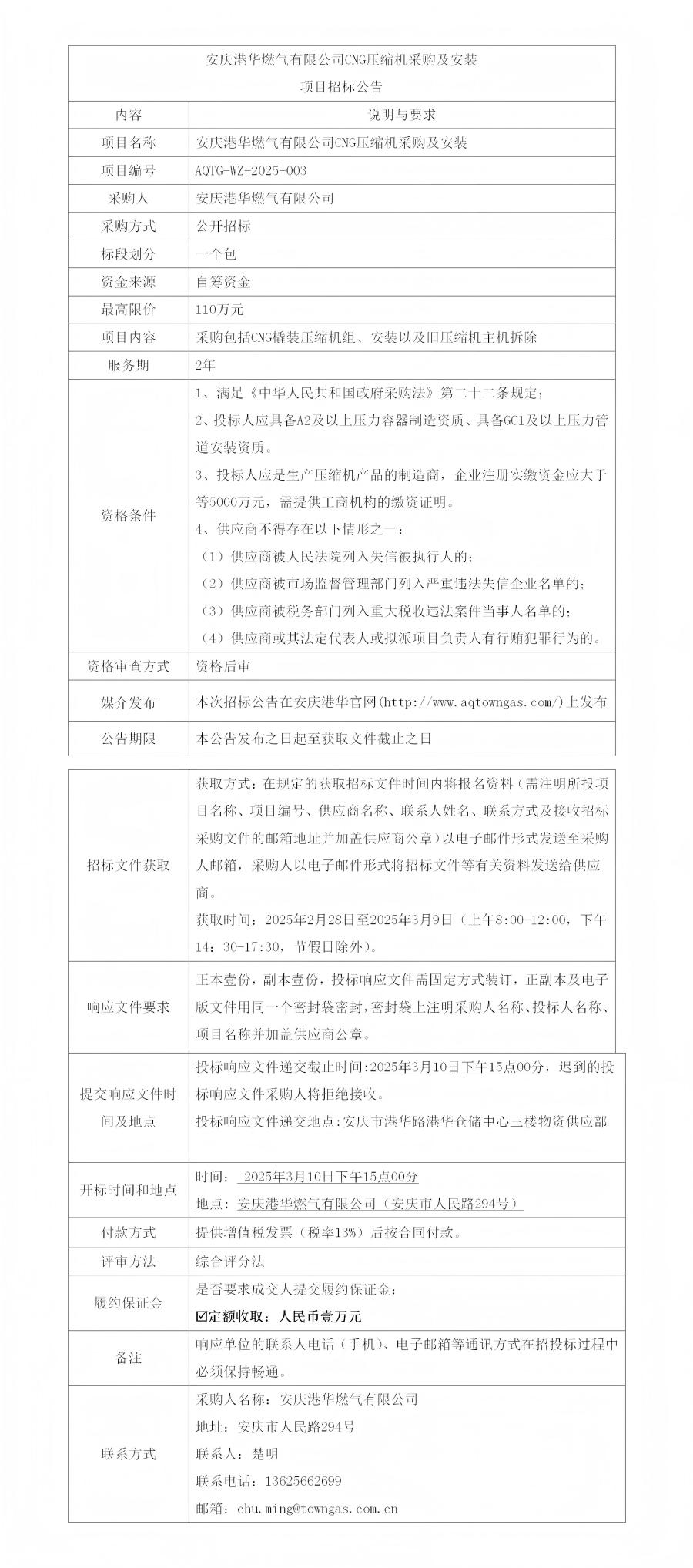 安慶港華燃氣有限公司CNG壓縮機采購及安裝項目招標(biāo)公告