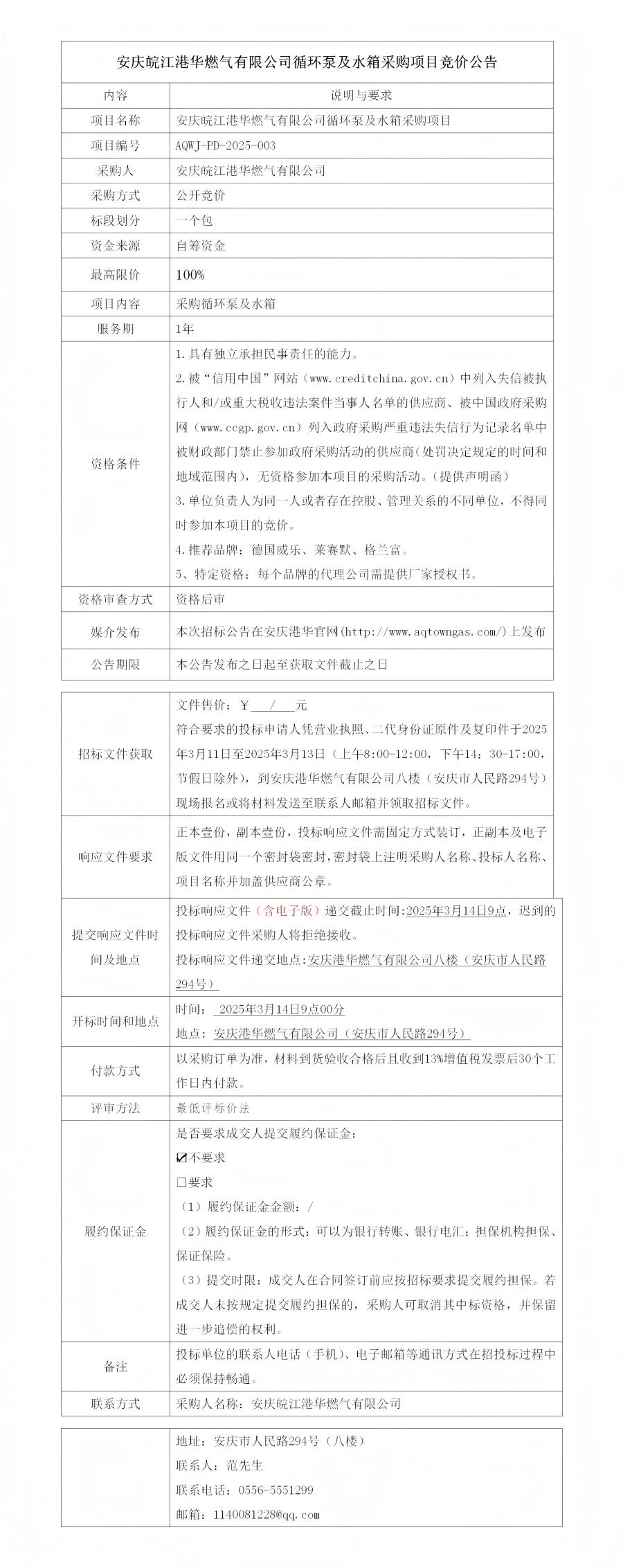 安慶皖江港華燃?xì)庥邢薰狙h(huán)泵及水箱采購項(xiàng)目競價(jià)公告
