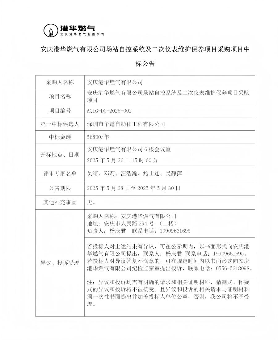 安慶港華燃?xì)庥邢薰緢稣咀钥叵到y(tǒng)及二次儀表維護(hù)保養(yǎng)項(xiàng)目采購項(xiàng)目中標(biāo)公告