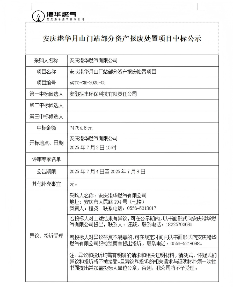 安慶港華月山門(mén)站部分資產(chǎn)報(bào)廢處置項(xiàng)目中標(biāo)公示