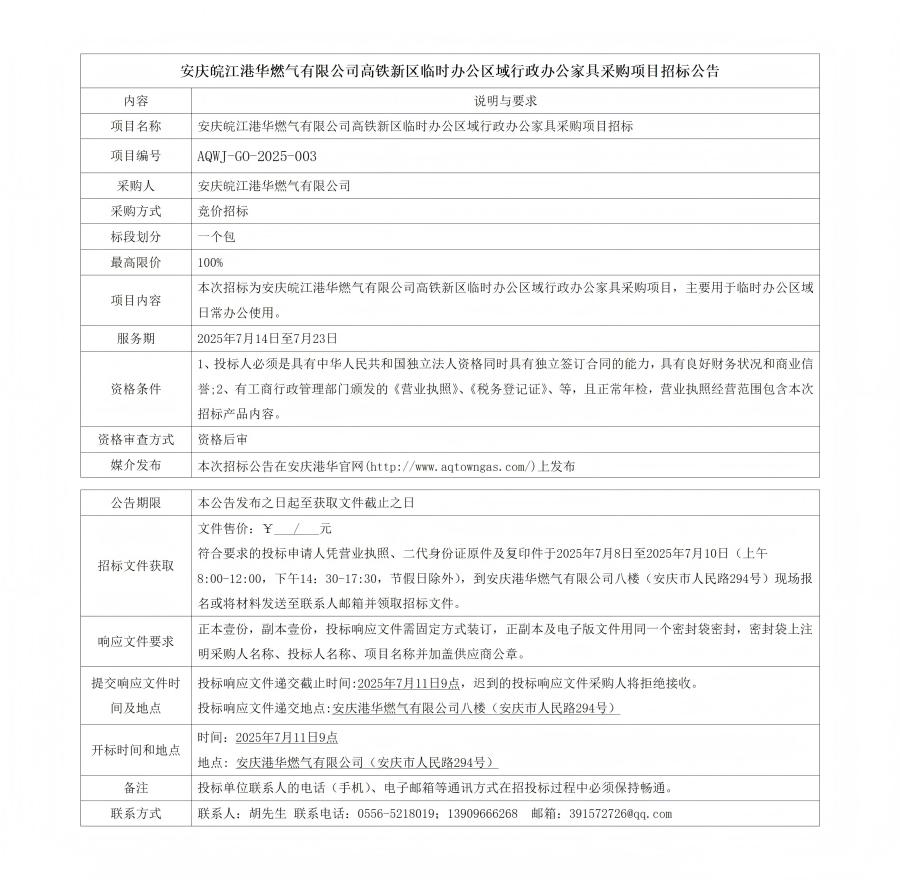 安慶皖江港華燃?xì)庥邢薰靖哞F新區(qū)臨時(shí)辦公區(qū)域行政辦公家具采購項(xiàng)目招標(biāo)公告