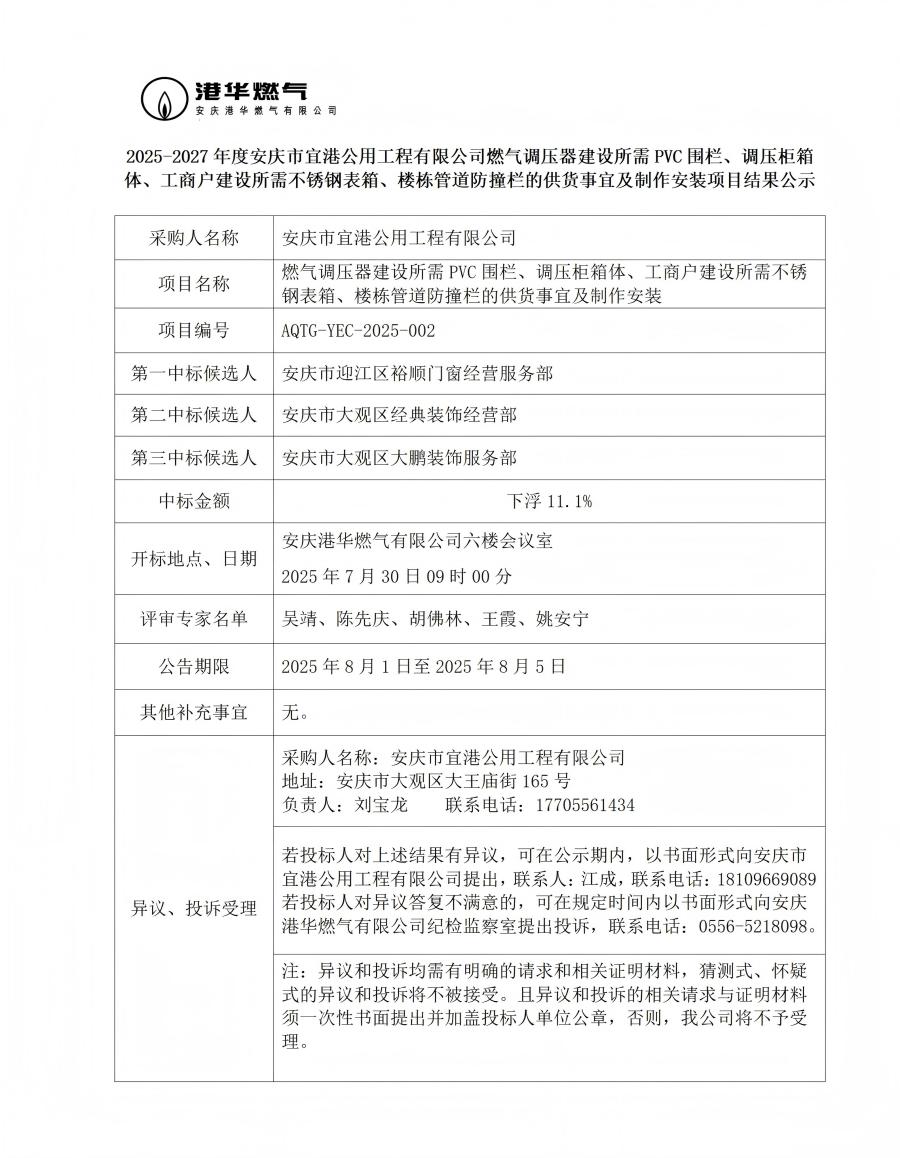 2025-2027年度安慶市宜港公用工程有限公司燃氣調(diào)壓器建設所需PVC圍欄、調(diào)壓柜箱體、工商戶建設所需不銹鋼表箱、樓棟管道防撞欄的供貨事宜及制作安裝項目結(jié)果公示