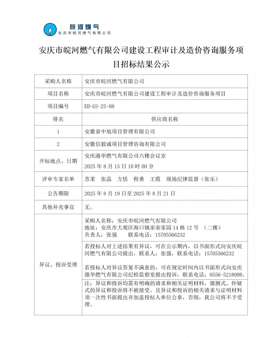 安慶市皖河燃氣有限公司建設(shè)工程審計及造價咨詢服務(wù)項目招標結(jié)果公示 發(fā)布時間:2025-08-18    閱讀次數(shù):1397次