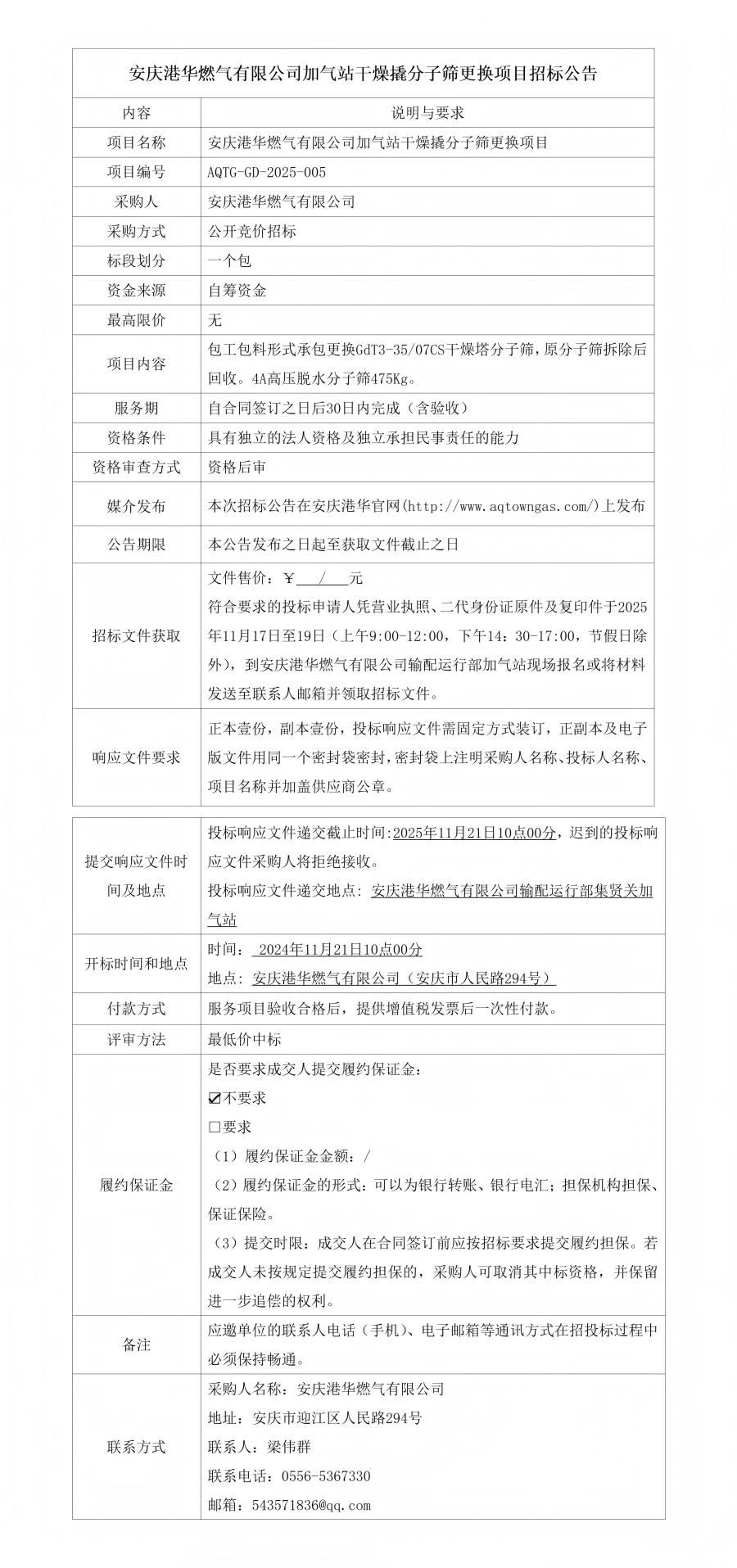 安慶港華燃氣有限公司加氣站干燥撬分子篩更換項目招標(biāo)公告