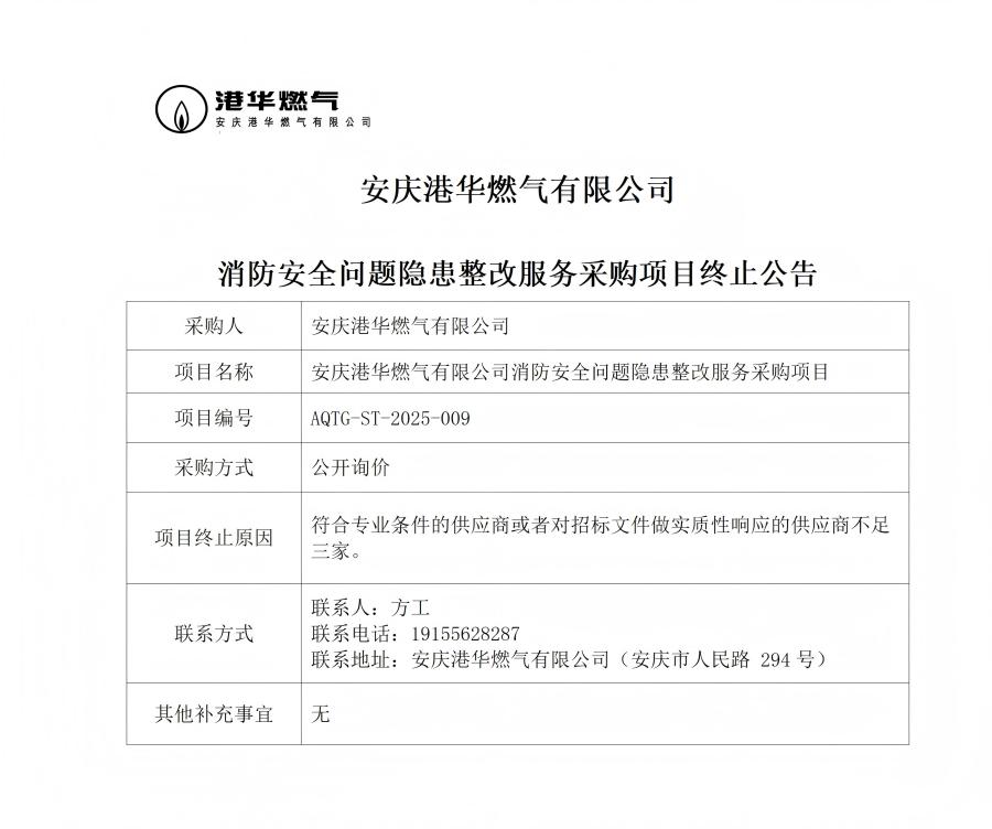 安慶港華燃氣有限公司消防安全問題隱患整改服務(wù)采購項目終止公告 發(fā)布時間:2025-12-12    閱讀次數(shù):705次