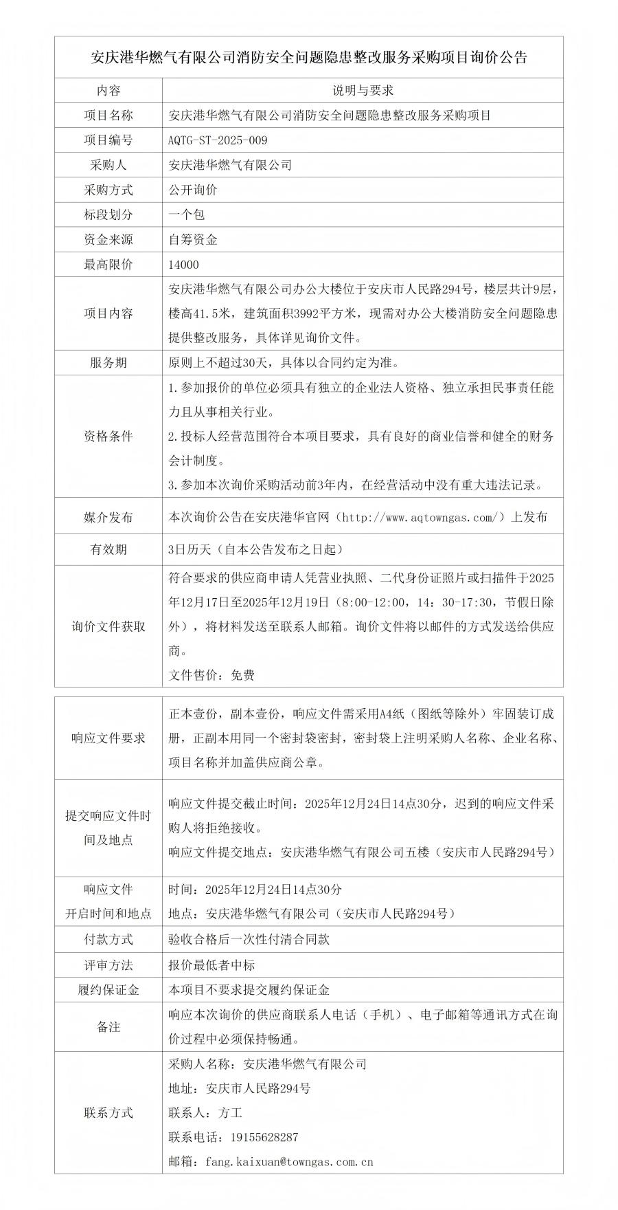 安慶港華燃?xì)庥邢薰鞠腊踩珕?wèn)題隱患整改服務(wù)采購(gòu)項(xiàng)目詢(xún)價(jià)公告