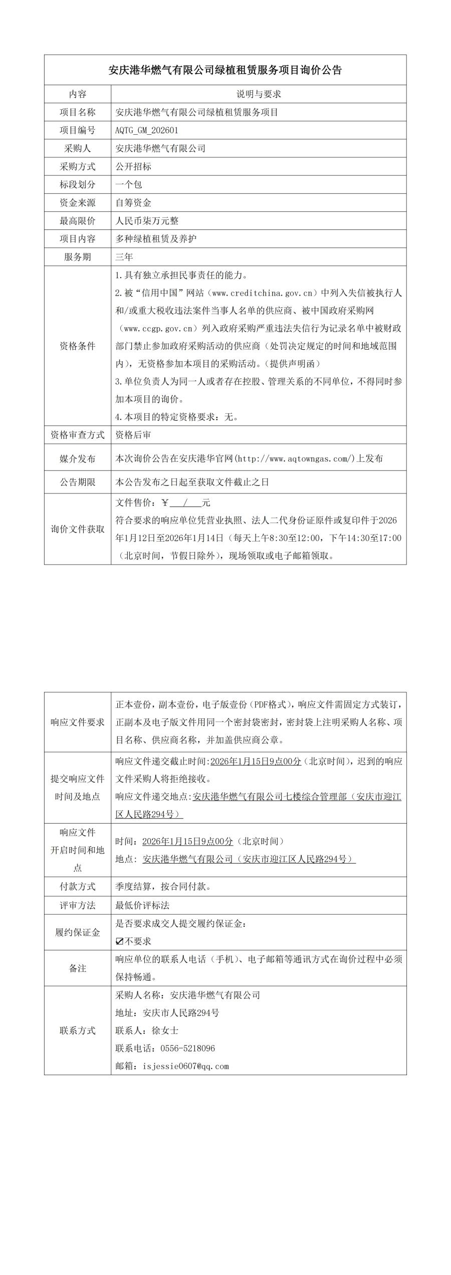 安慶港華燃?xì)庥邢薰揪G植租賃服務(wù)項(xiàng)目詢價(jià)公告 發(fā)布時(shí)間:2026-01-12    閱讀次數(shù):718次
