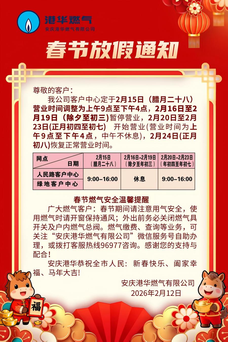 安慶港華燃氣客戶中心春節(jié)放假通知